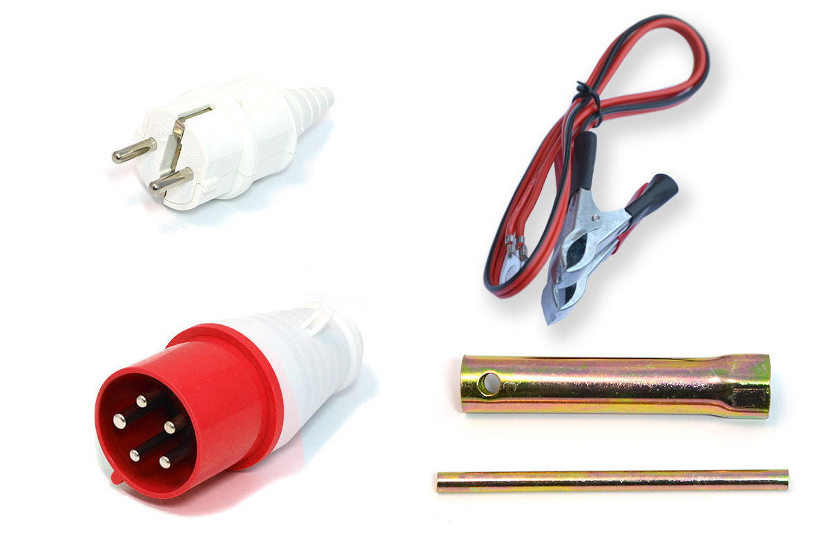 | Комплектация | Электрическая вилка - 2 шт., комплект проводов, ручки и колёса, блок АВР |