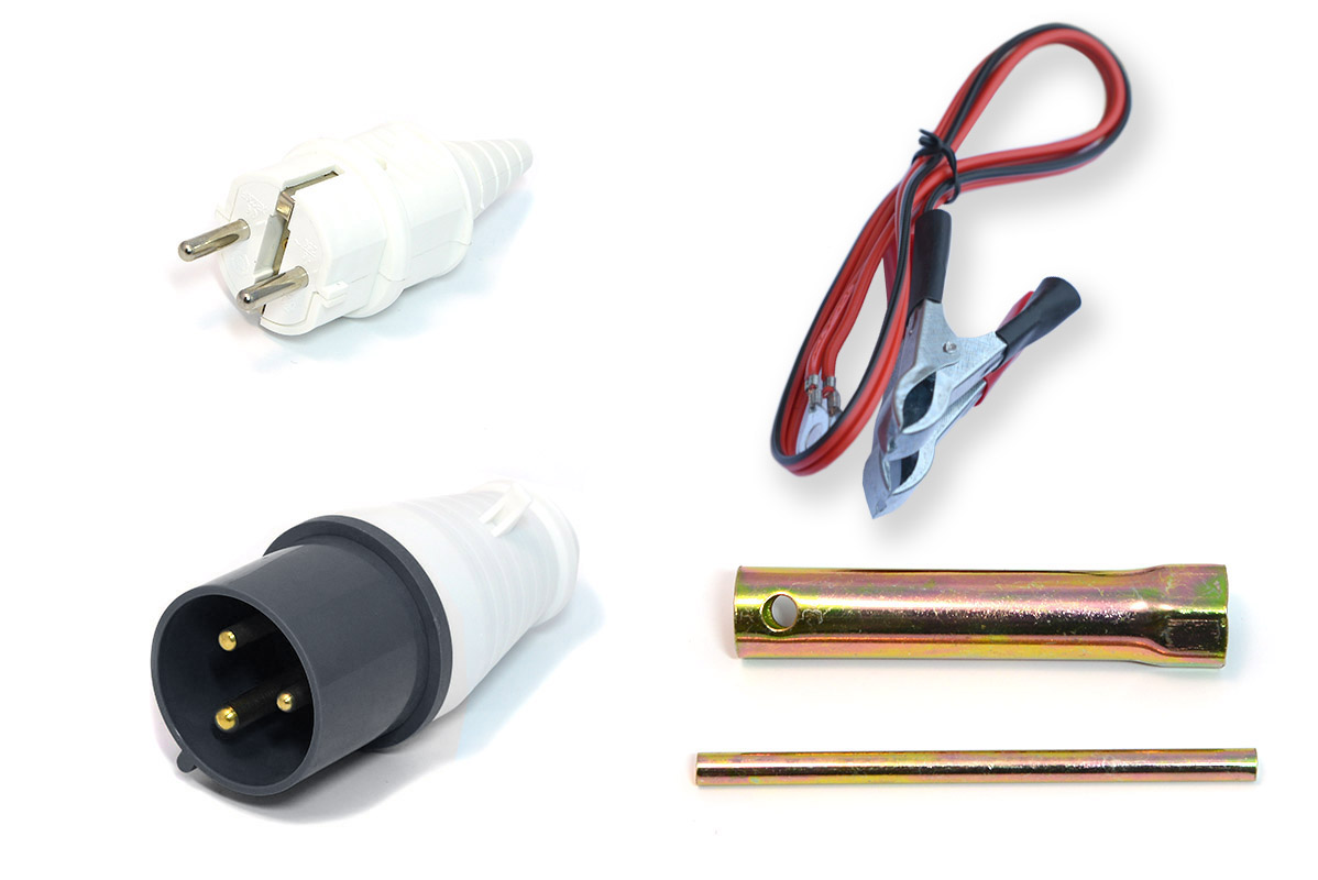 | Комплектация | Электрическая вилка - 2 шт., комплект проводов, ручки и колёса |