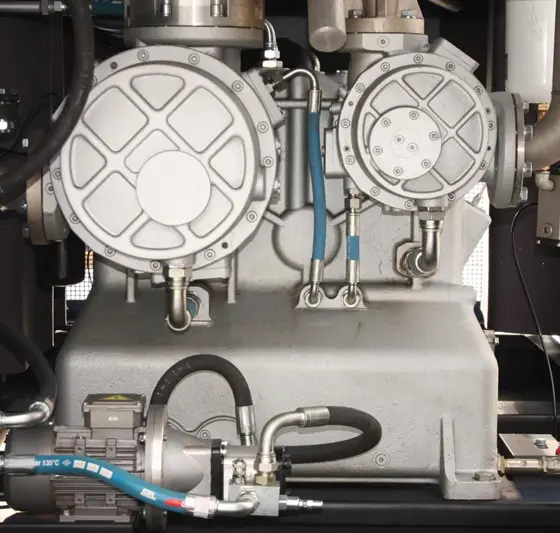 - Для смазки подшипников и редуктора используется отдельная система с масляным радиатором. Это исключает попадание масла в сжатый воздух.