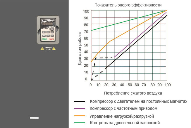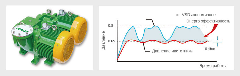 - Компрессор DENAIR с синхронным электродвигателем на постоянных магнитах и частотным преобразователем уменьшает расход электроэнергии в среднем на ошеломляющие 50%.