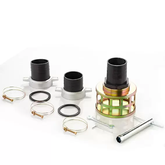 - Полный комплект аксессуаров: фильтр-сетка, переходники, а также хомуты для фиксации шлангов.