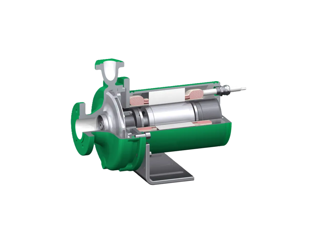 Весь конструктив насоса заключен в герметичный корпус, а благодаря специальному экрану из нержавеющей стали статор электродвигателя отделен от стороны хладагента. В конструкции моторной части насоса предусмотрено дополнительное рабочее колесо, предназначенное для повышения статического давления отобранного для охлаждения частичного потока хладагента и снижения риска его вскипания.