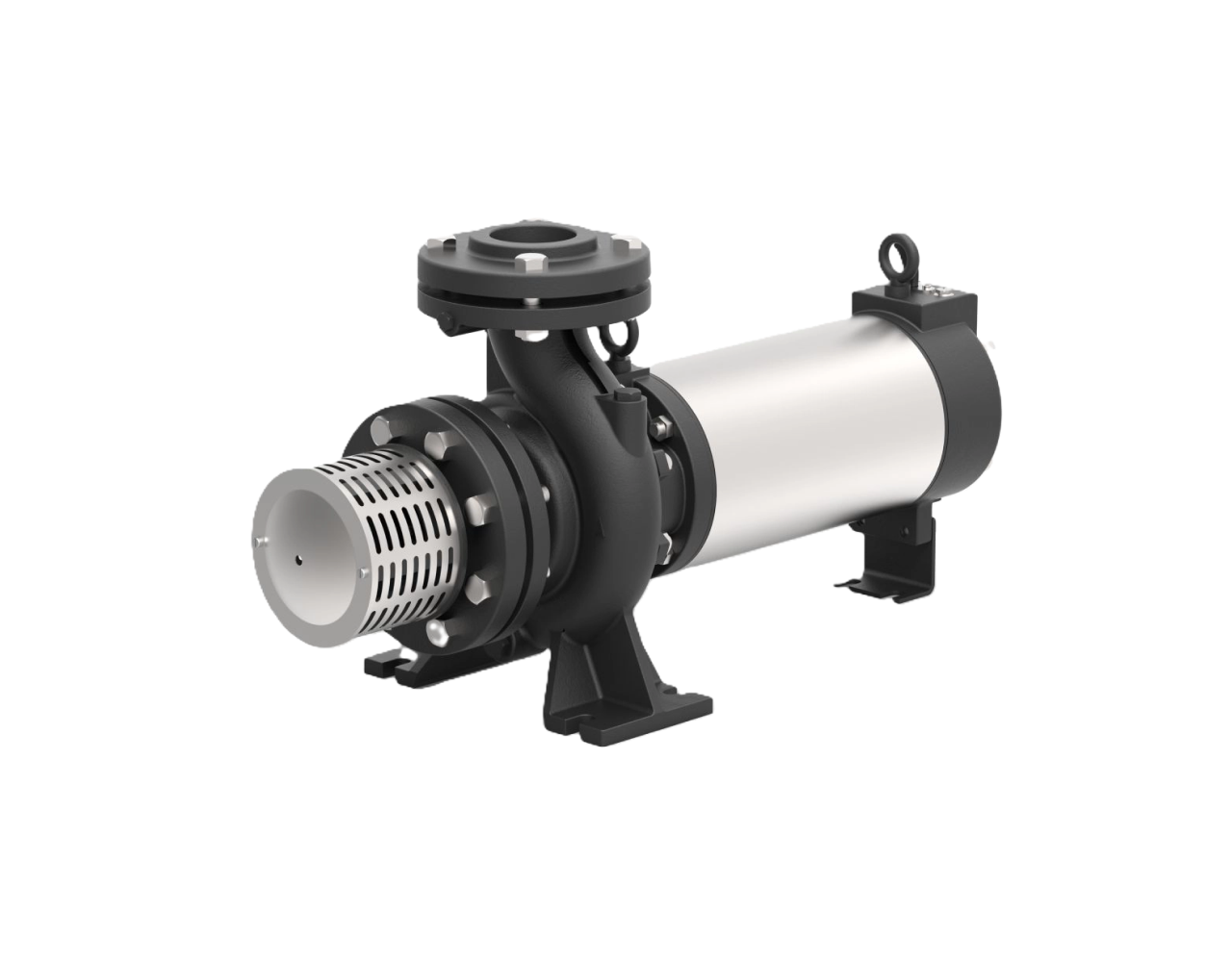 - Конец насоса плотно соединён с погружным двигателем с возможностью перемотки, заполненным водой и смазываемым водой, с режимом работы S1 и защитой IP68, трёхфазным, на 415 В, 50 Гц и 60 Гц.