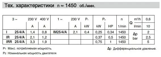 - I 25/4, IR 25/4, IRR 25/4E: трехфазный (230/400 В ±10%)