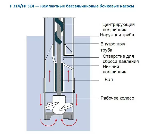 - Рабочее колесо создает поток, направляя жидкость аксиально (вдоль вала) к выходу.