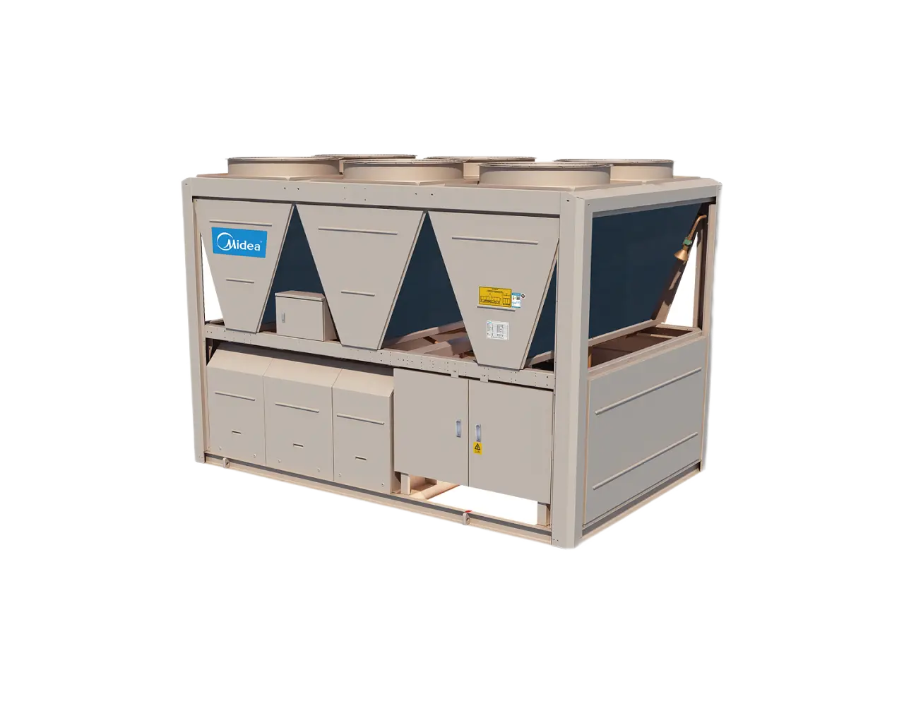 Высокопроизводительные чиллеры Midea со спиральным компрессором и воздушным охлаждением конденсатора включают модули 340 и 460 кВт. Можно объединить до 8 модулей в одну систему, при этом общая холодопроизводительность может достигать 3680 кВт.