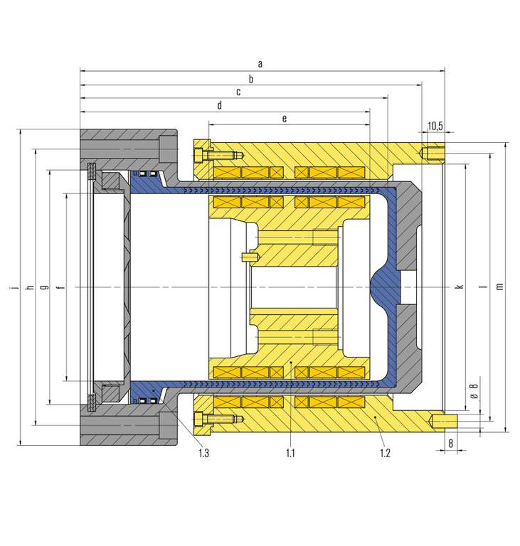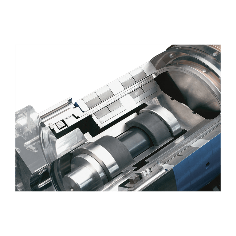 Передача усилия происходит посредством магнитов бесконтактно от привода к валу, вращающемуся внутри продукта. Между роторами находится щелевой стакан, уплотняющий элемент. Он статически герметизирован относительно пространства с продуктом.