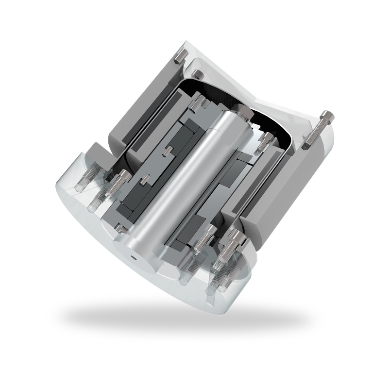 Щелевой стакан для NMB состоит из колец, электрически изолированных уплотнениями из ПТФЭ, и внешнего щелевого стакана со шлицами. Благодаря этому к минимуму сводятся потери от вихревых токов (прим. 2 % мощности привода). В результате, магнитные муфты NMB могут передавать большой крутящий момент и эксплуатироваться в условиях больших скоростей вращения и высокого давления.