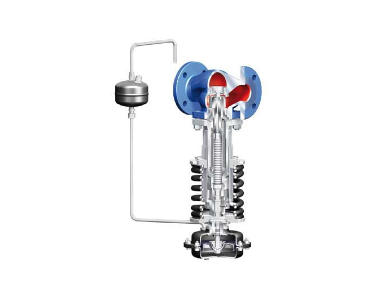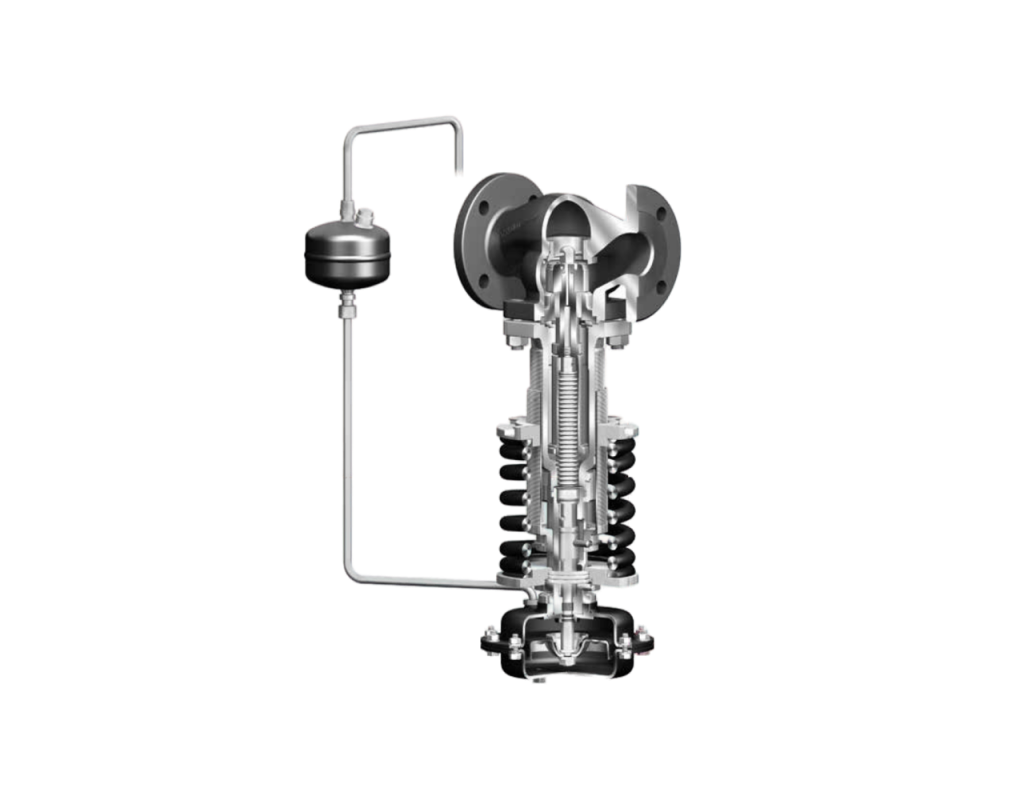 Регулируется давление на входе в клапан, т.е. клапан открывается при возрастающем давлении, когда оно превышает установленное значение. При последующем падении давления перед клапаном ниже заданного значения, клапан автоматически закрывается. Благодаря встроенному сильфону из нержавеющей стали клапан работает независимо от выходного давления.