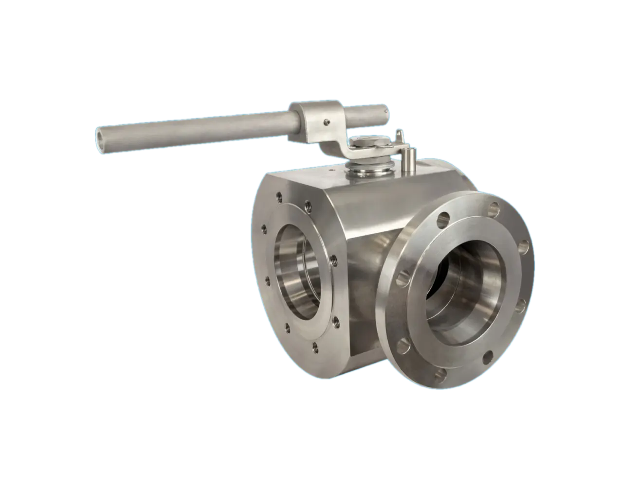 Трехходовой 90° шаровой кран «межфланцевого типа», полнопроходной ISO 14313, изготовлен из круглого прутка, в соответствии с EN 12516.2; ASME B16.34; ISO 14313; EN 1092-1; ASME B16.5.